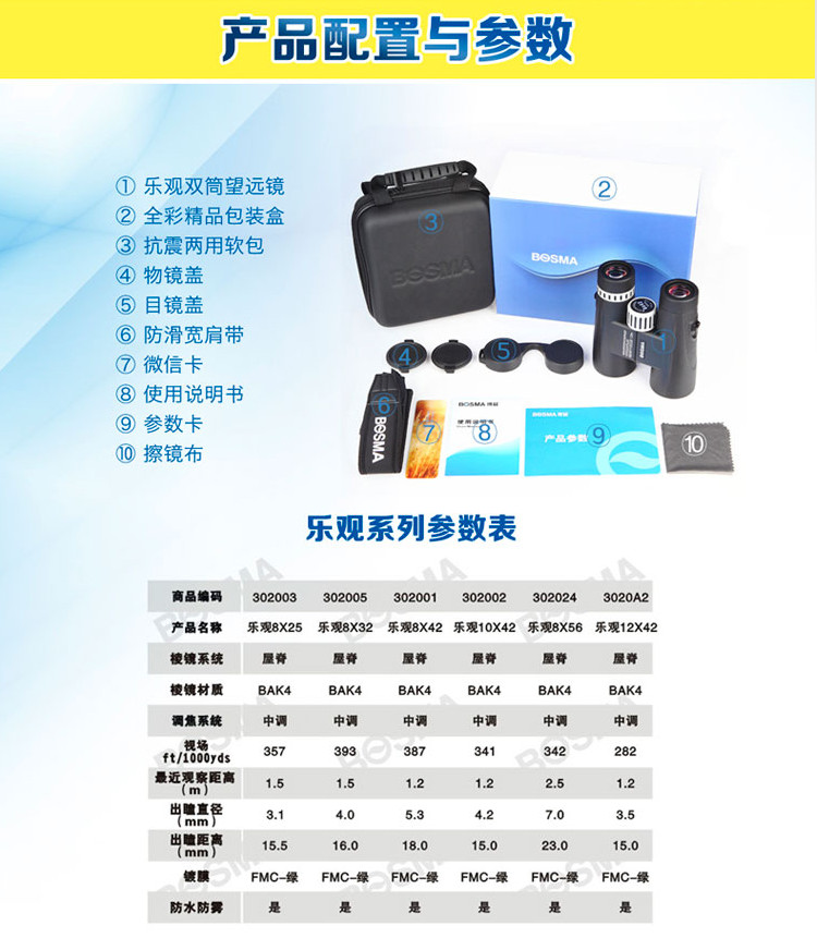 BOSMA乐观系列8x42 10x42 12x42展示图(此三款外观大小尺寸全部一样只是倍数不一样而已哦!):
