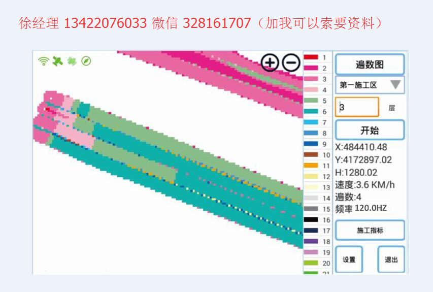 大坝智能压实车载系统安装在碾压车的平板电脑上。车手可以实时查看当前碾压轨迹、碾压遍数、振动频率、车速等;同时平板里的数据通过无线网络回传到控制中心;网络信号不佳时,会暂存在平板本地;数据也可以离线上传到后台,查看碾压视图,历史轨迹,生成报告等。