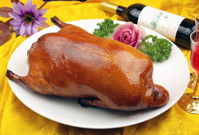 烤鸭是具有世界声誉的汉族菜式。用料为优质肉食北京鸭,用果木炭火烤制。它以色泽红润,肉质细嫩,味道醇厚,肥而不腻的特色享誉海内外。且历史悠久,距今已经1600多年,号称天下第一吃,是清代宫廷御菜。北京鸭属水禽,肉质细腻,口感良好,营养丰富,含有大量的不饱和脂肪酸,在人体内不积蓄,人体吸收后能软化心脑血管。该鸭的表皮中含有大量的胶原蛋白,是美容佳品。