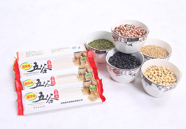 河南道家香五谷杂粮面 河南道家香五谷杂粮面选用豫东优质小麦粉,石磨面粉加入黑豆粉,绿豆粉,黑米粉等对人体有益的营养成份,科学配方,经先进的制面工艺加工而成,口感纯正,营养丰富