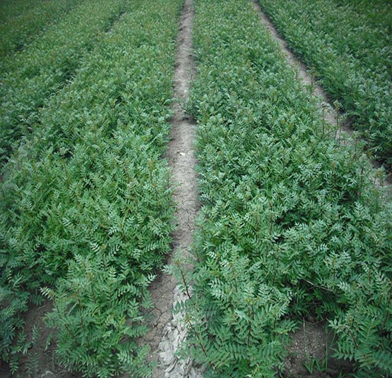 3.播种。香椿露地育苗一般在日均最低气温1℃~5℃或10厘米土层地温在13℃时进行为宜,大棚育苗可比露地提早20~30天播种。播种方法有撒播和条播两种,撒播时先灌足底墒水,待水下渗后播种,亩播量3~4公斤,播后覆土1厘米厚。条播时按行距25~30厘米、深2~3厘米开沟。浇小水湿沟,水下渗后,将种子均匀播于沟内,播后覆土1.5~2厘米厚,亩用种量1.5~2公斤。