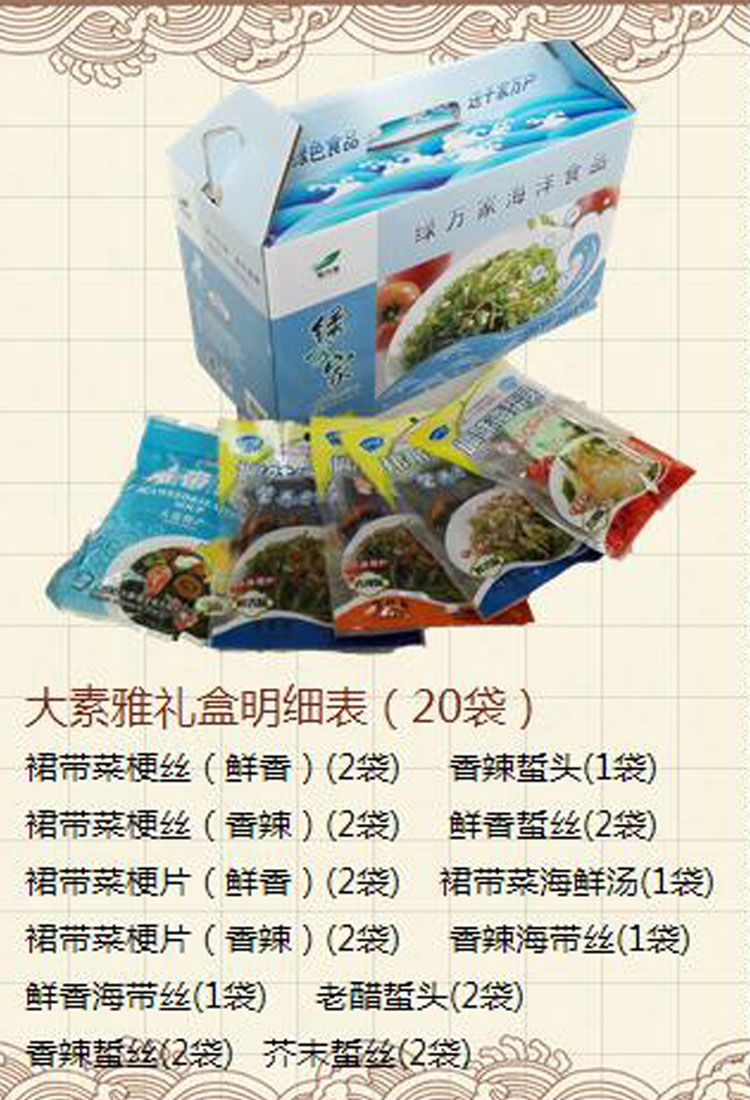 大连绿万家 大素雅礼盒 2893g 大连绿万家 大素雅礼盒 2893g 内含裙带菜海鲜汤 鲜香/香辣蜇丝 鲜香/香辣海带丝 老醋蛰头等 即食裙带菜 海中长生草 鲜嫩有嚼劲