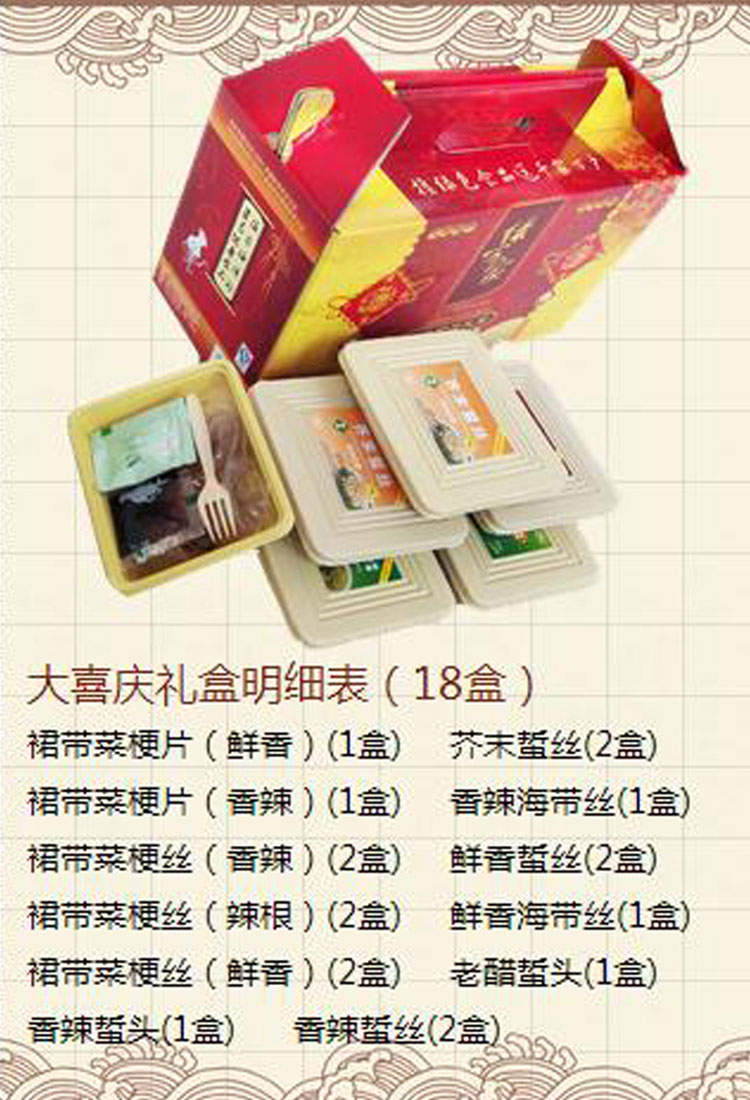大连绿万家 大喜庆礼盒 2700g 大连绿万家 大喜庆礼盒 2700g 内含裙带菜梗片 裙带菜梗片 鲜香/香辣蜇丝 鲜香/香辣海带丝 老醋蛰头等 开袋即食 美味可口 送礼佳品