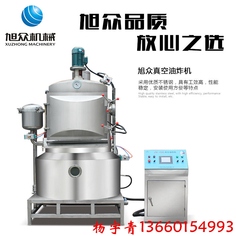 广州旭众食品机械研发生产的真空油炸机强调一个实质性的特点,真空状态下“低温油炸”,而低温真空油炸的休闲食品更加提倡的是休闲食品的“保健养生功能”,有效保留食品本身营养价值。
