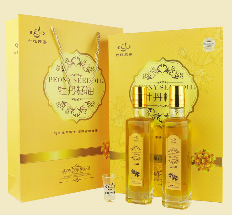 牡丹籽油食用牡丹籽油对身体的几大益处:1、血管清道夫,避免血脂、胆固醇沉积。2、益智健脑,预防老年痴呆,提高儿童智力。3、提高免疫力,增强身体活力。三餐选择牡丹籽油的四大理由:1、不饱合脂肪酸含量达90%以上,居当前发现油类之首。2、R-亚麻酸(欧米伽-3)含量达40%以上,是当前发现油类之M倍。3、亚油酸含量达23%以上,是当前发现油类之N倍。4、牡丹皂苷、牡丹酚、牡丹多糖、牡丹醇等多种独有活性成份也仅仅是牡丹籽油的冰山一角,随着研究的深入,每年都重要新发现。牡丹籽油食用方法:1、直接饮用,为健康加油。 2、凉拌菜用,清香四溢。3、蒸米饭用,晶莹剔透。 4、煎炒烹炸,别具风味。