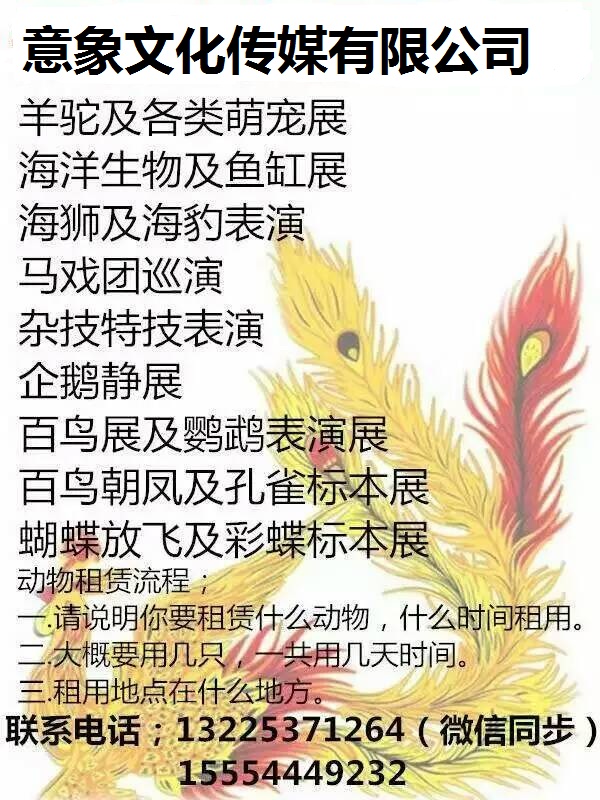 目前我们公司有萌宠动物50多种,可以经营的项目有:海狮表演,迎 合 市场需求,我们公司合作对象,一般是文化传媒公司、广 告 公司、目前我们公司有萌宠动物50多种,可以经营的项目有:海狮表演,我们公司提供所需要的动物,利用动物的精彩表演,来提 高 商业活动文化艺 术 交流及策划、影视策划咨 询 、动漫设计他们负责策划宣传,包括代理一些网站的广 告 栏,招商一些室外的广 告 牌,公司类型是服务类型公司。迎 合 市场需求,我们公司合作对象,一般是文化传媒公司、广 告 公司、目前我们公司有萌宠动物50多种,可以经营的项目有:海狮表演,山东意象动物租赁中心,是国内比较早的出租行业。我们公司提供所需要的动物,利用动物的精彩表演,来提 高 商业活动文化艺 术 交流及策划、影视策划咨 询 、动漫设计马戏团表演,鹦鹉表演,企鹅展览,海豹出租,大象出租,羊驼租赁,迎 合 市场需求,我们公司合作对象,一般是文化传媒公司、广 告 公司、