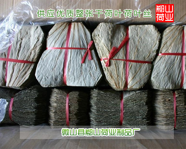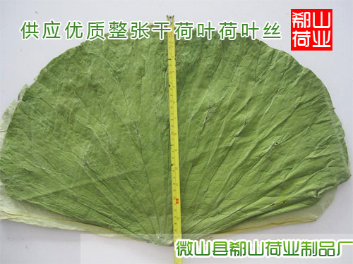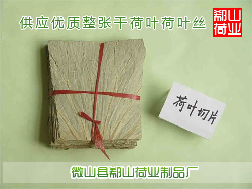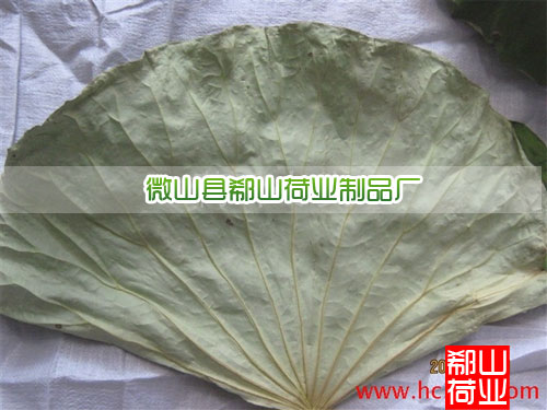荷叶叶多折成半圆形或扇形,展开后呈类圆形,直径20至50厘米,全缘或稍波状。上表面深绿色或黄绿较粗糙;下表面淡灰棕色,较光滑,有粗脉21至22条,处中心向四周射出,中心有突起的叶西峡钱基。质脆,易破碎。微有清香气,味微苦。以叶大、整洁、色绿者为佳。