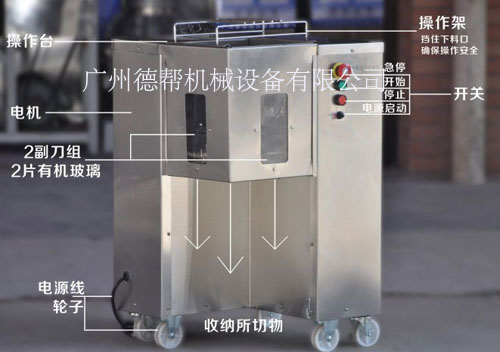 德帮牌一次性切丝机,可以把肉一次性切成丝,两对双刀组,十字摆放,双电机驱动,可分别控制,切片切丝均可,适合于规模大的餐饮或肉类加工企业。