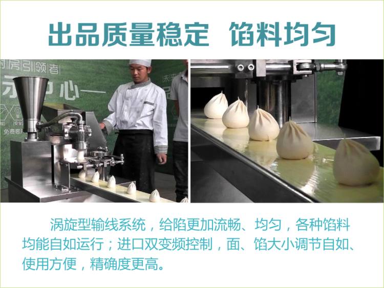 涡旋型输线系统,给陷更加流畅、均匀,各种馅料均能自如运行;进口双变频控制,面、馅大小调节自如、使用方便,精确度更高。