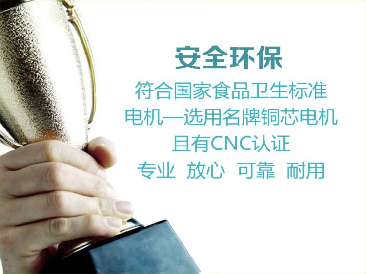 采用优质不锈钢制造,坚固耐用,美观大方,符合国家食品卫生标准,电机—选用名牌铜芯电机,且有CNC认证。
