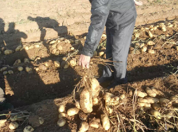 本公司的土豆种是从正规科研单位——内蒙古脱毒种业调进的经过正规脱毒的优良种子。播种后表现为:出苗快,苗全苗壮,茎叶生长旺盛,叶片浓绿肥厚,植株非常整齐,花蕾败育,抗病性强,无病害,纯度在98%以上,而且结薯集中,薯形一致,表皮光滑,亮度大,大薯率高,商品性极好。未经过脱毒甚至已携带病毒的商品薯作种子,田间表现为:出苗慢、缺苗严重、秧苗瘦弱,不团棵,植株成辣椒苗,参差不齐,叶片发黄、开花,晚疫病和疮痂发生严重。纯度很差,且结薯不集中,薯形不一致,大小不均匀,商品极差。