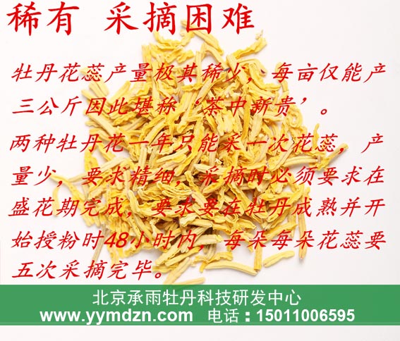 承雨牡丹花蕊茶------色泽金黄,清香宜人,可活血化瘀、养颜明目、通利二便、维护前列腺健康。万朵牡丹花中只能选取出百余个最具生命力的雄性花蕊,从而保证雄性花蕊的最高价值;牡丹花初开期为三天,最明显的特点是雄蕊成熟,并且开始散粉,到第三天雄蕊花粉散尽,雄蕊干枯,生命力消失,因此选择未脱落的生命力旺盛的雄性花蕊。每年4月是牡丹初开期,牡丹花初开第一天、第二天是雄蕊散粉时期,此两天才能采摘到具有花粉的、生命力最强,营养价值最丰富的雄性花蕊。牡丹花蕊的采摘不但不影响结籽,还有助于授粉。