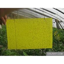 同翅目的蚜虫、粉虱、叶蝉等;双翅目的斑潜蝇、种蝇等;蝇翅目的蓟马等多种害虫对黄色或蓝色敏感,具有强烈的趋性。经过过农业专家的多年试验,通过色谱分析确认了某一种特殊黄色/蓝色具有很好的诱虫效果。我公司采用这种特殊颜色PC板材配以特殊高强度粘胶,开发出高效杀虫板,实践表明对上述害虫诱杀效果非常显著。