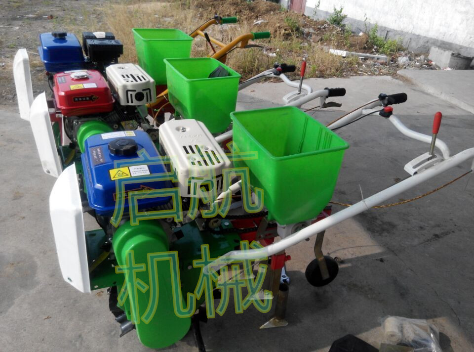 多功能汽油施肥播种器:是旱田使用的小型机械。适用于所有旱田农作物垄间作业。是广大农民朋友实现农业机械化的首选产品。选配正规企业生产的变速箱,优质名牌汽油机为配套动力。易启动,轻便耐用。整体板设计,一次成型,坚固耐用。加粗手把。人性化的优质手油门设计。新款增添了高低空档挂挡离合功能独特的主轮设计不溜沟,扬尘少,减少向变速箱漏土及缠草。 主要功能:施肥;播种;松土;除草;开沟;扶垄;培土等 发动机:四冲程 单缸 空气冷却 施肥播种;行距和株距任意调制   耕宽:460mm  耕深:60mm 速度:3600kw/min  排量:216CC 最大功率:7.5KW/3600rpm(7.5马力) 工作效率:约3-4亩/时 启动方式:手拉启动 净重:50KG  毛重:70KG 外箱尺寸:110X74.5X90cm  1:手把能高低,长短调节,适用于每一个人。  2:耘锄板经过高温渗碳处理,不需再加工。  3:先进的耘锄架设计,斜支板设有调整孔,用来调节耘锄板的抬头,低头, 耘地的深浅。耘锄腿的高低调节是手把高低的辅助调节,不起耘地深浅的调节作用。  4:化肥斗支架有前后3个螺丝固定,方便拆卸,不使用时可以卸掉,以防碰坏。独创的分离设计,三角带传动,不存在顶链条的问题。播种施肥可双行,单行,前后使用,耘地施肥可同时进行。调节手柄,施肥量5~50千克可调。更换楼心,可以直播各种农作物。  5:施肥播种,耙地时,设有压土轮,不用抬着,省力方便。  6:简单合理的支称,在使用单行播种,施肥,单铧耘地时,支称下放,整机能够水平放置。方便添加种子,化肥。实现一人操作。  7:培土器有左,右分土铲。安装在耘锄架左,右滑块上,实现双行培土。滑块左,右互换,能够把分土铲前角靠在一起,实现平地开沟。分土铲左,右互换,实现平地扶垄。斜支板的调整孔来调节分土铲深浅及分土,培土多少。点播原种,直播毛仔,一次成功,每小时1~1.5亩,设计合理不存在缺陷。更换楼心,可以精播棉花,玉米,花生,大豆,向日葵。调整手柄播种量大,小随意可调。备注:以上设备都是不含运费的价格! 免除了中间商,生产者直接与用户见面,简化了流通过程,缩短了流通时间实现了真正的厂家优惠价格。厂家地址:山东省曲阜市王庄开发区!全球诚聘招商中! 诚信提示:首付预付款,即可物流快运,货到后付剩余款!两年内非人为因素,因产品质量机器零配件需要更换的,公司除免费更换外,并承担配件包装、运输费用。有意需求者欢迎随时与我联系:(24小时客服服务)