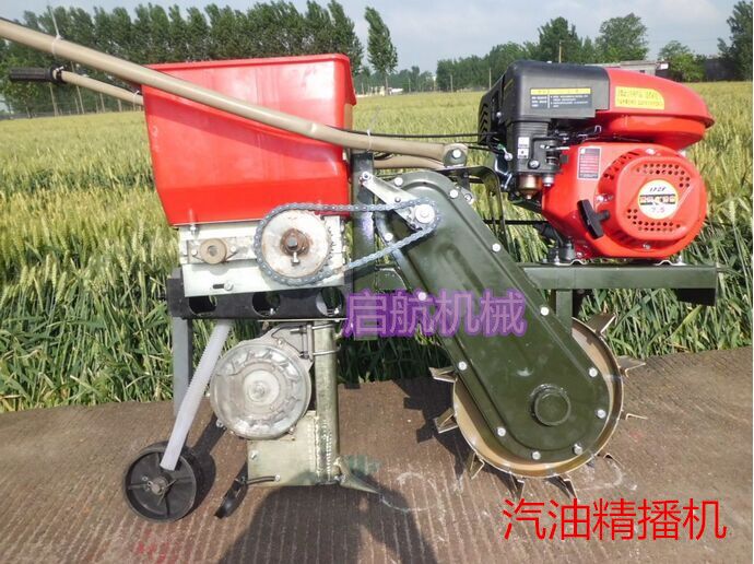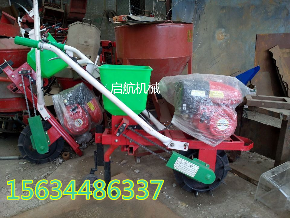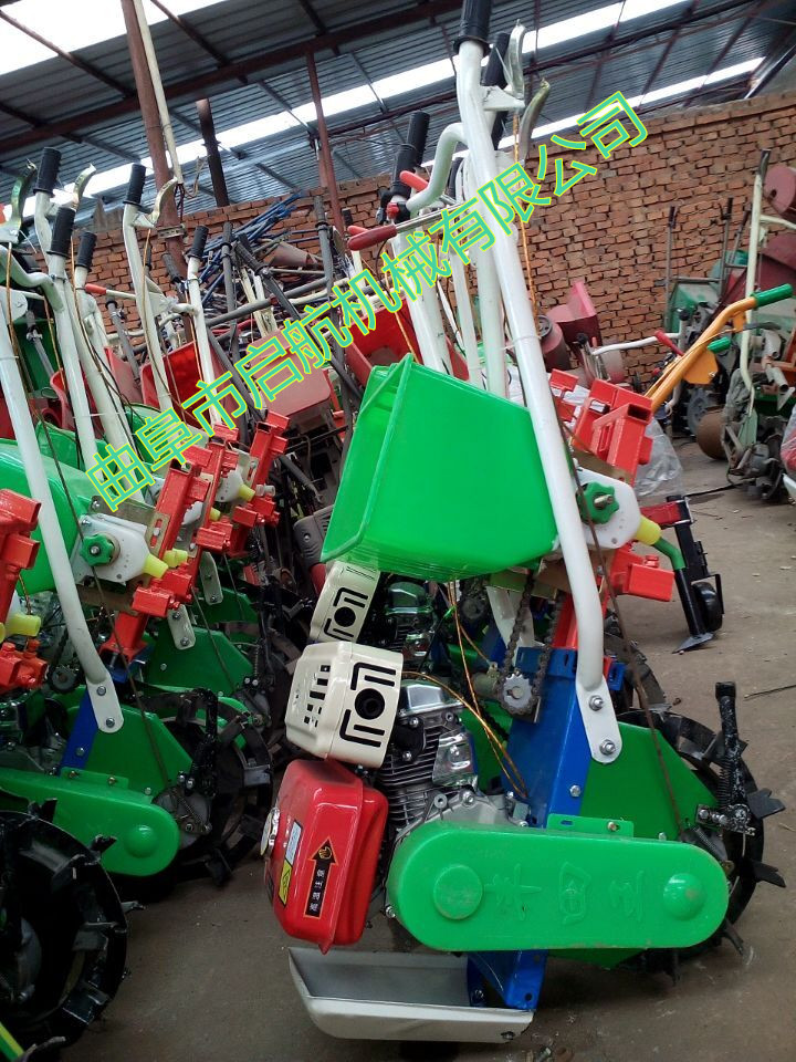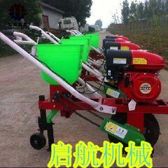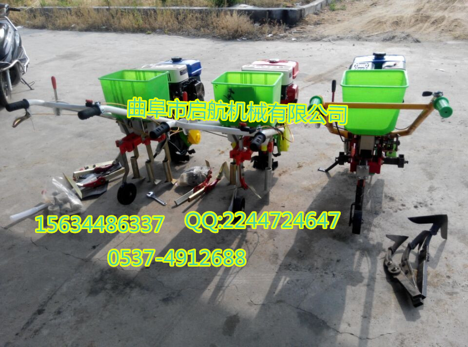 多功能汽油施肥播种器:是旱田使用的小型机械。适用于所有旱田农作物垄间作业。是广大农民朋友实现农业机械化的首选产品。选配正规企业生产的变速箱,优质名牌汽油机为配套动力。易启动,轻便耐用。整体板设计,一次成型,坚固耐用。加粗手把。人性化的优质手油门设计。新款增添了高低空档挂挡离合功能独特的主轮设计不溜沟,扬尘少,减少向变速箱漏土及缠草。 主要功能:施肥;播种;松土;除草;开沟;扶垄;培土等 发动机:四冲程 单缸 空气冷却 施肥播种;行距和株距任意调制   耕宽:460mm  耕深:60mm 速度:3600kw/min  排量:216CC 最大功率:7.5KW/3600rpm(7.5马力) 工作效率:约3-4亩/时 启动方式:手拉启动 净重:50KG  毛重:70KG 外箱尺寸:110X74.5X90cm  1:手把能高低,长短调节,适用于每一个人。  2:耘锄板经过高温渗碳处理,不需再加工。  3:先进的耘锄架设计,斜支板设有调整孔,用来调节耘锄板的抬头,低头, 耘地的深浅。耘锄腿的高低调节是手把高低的辅助调节,不起耘地深浅的调节作用。  4:化肥斗支架有前后3个螺丝固定,方便拆卸,不使用时可以卸掉,以防碰坏。独创的分离设计,三角带传动,不存在顶链条的问题。播种施肥可双行,单行,前后使用,耘地施肥可同时进行。调节手柄,施肥量5~50千克可调。更换楼心,可以直播各种农作物。  5:施肥播种,耙地时,设有压土轮,不用抬着,省力方便。  6:简单合理的支称,在使用单行播种,施肥,单铧耘地时,支称下放,整机能够水平放置。方便添加种子,化肥。实现一人操作。  7:培土器有左,右分土铲。安装在耘锄架左,右滑块上,实现双行培土。滑块左,右互换,能够把分土铲前角靠在一起,实现平地开沟。分土铲左,右互换,实现平地扶垄。斜支板的调整孔来调节分土铲深浅及分土,培土多少。点播原种,直播毛仔,一次成功,每小时1~1.5亩,设计合理不存在缺陷。更换楼心,可以精播棉花,玉米,花生,大豆,向日葵。调整手柄播种量大,小随意可调。备注:以上设备都是不含运费的价格! 免除了中间商,生产者直接与用户见面,简化了流通过程,缩短了流通时间实现了真正的厂家优惠价格。厂家地址:山东省曲阜市王庄开发区!全球诚聘招商中! 诚信提示:首付预付款,即可物流快运,货到后付剩余款!两年内非人为因素,因产品质量机器零配件需要更换的,公司除免费更换外,并承担配件包装、运输费用。有意需求者欢迎随时与我联系:(24小时客服服务)