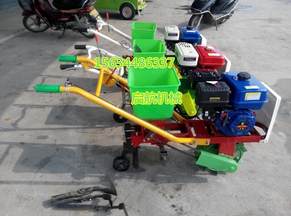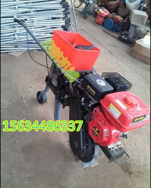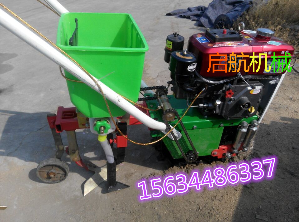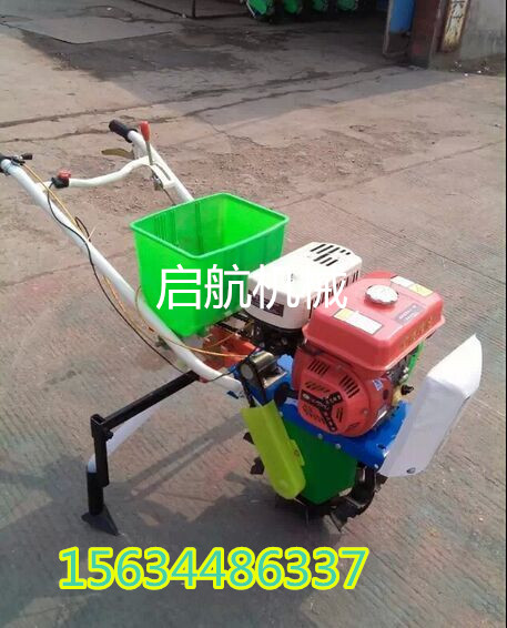 多功能汽油施肥播种器:是旱田使用的小型机械。适用于所有旱田农作物垄间作业。是广大农民朋友实现农业机械化的首选产品。选配正规企业生产的变速箱,优质名牌汽油机为配套动力。易启动,轻便耐用。整体板设计,一次成型,坚固耐用。加粗手把。人性化的优质手油门设计。新款增添了高低空档挂挡离合功能独特的主轮设计不溜沟,扬尘少,减少向变速箱漏土及缠草。 主要功能:施肥;播种;松土;除草;开沟;扶垄;培土等 发动机:四冲程 单缸 空气冷却 施肥播种;行距和株距任意调制   耕宽:460mm  耕深:60mm 速度:3600kw/min  排量:216CC 最大功率:7.5KW/3600rpm(7.5马力) 工作效率:约3-4亩/时 启动方式:手拉启动 净重:50KG  毛重:70KG 外箱尺寸:110X74.5X90cm  1:手把能高低,长短调节,适用于每一个人。  2:耘锄板经过高温渗碳处理,不需再加工。  3:先进的耘锄架设计,斜支板设有调整孔,用来调节耘锄板的抬头,低头, 耘地的深浅。耘锄腿的高低调节是手把高低的辅助调节,不起耘地深浅的调节作用。  4:化肥斗支架有前后3个螺丝固定,方便拆卸,不使用时可以卸掉,以防碰坏。独创的分离设计,三角带传动,不存在顶链条的问题。播种施肥可双行,单行,前后使用,耘地施肥可同时进行。调节手柄,施肥量5~50千克可调。更换楼心,可以直播各种农作物。  5:施肥播种,耙地时,设有压土轮,不用抬着,省力方便。  6:简单合理的支称,在使用单行播种,施肥,单铧耘地时,支称下放,整机能够水平放置。方便添加种子,化肥。实现一人操作。  7:培土器有左,右分土铲。安装在耘锄架左,右滑块上,实现双行培土。滑块左,右互换,能够把分土铲前角靠在一起,实现平地开沟。分土铲左,右互换,实现平地扶垄。斜支板的调整孔来调节分土铲深浅及分土,培土多少。点播原种,直播毛仔,一次成功,每小时1~1.5亩,设计合理不存在缺陷。更换楼心,可以精播棉花,玉米,花生,大豆,向日葵。调整手柄播种量大,小随意可调。备注:以上设备都是不含运费的价格! 免除了中间商,生产者直接与用户见面,简化了流通过程,缩短了流通时间实现了真正的厂家优惠价格。厂家地址:山东省曲阜市王庄开发区!全球诚聘招商中! 诚信提示:首付预付款,即可物流快运,货到后付剩余款!两年内非人为因素,因产品质量机器零配件需要更换的,公司除免费更换外,并承担配件包装、运输费用。有意需求者欢迎随时与我联系:(24小时客服服务)