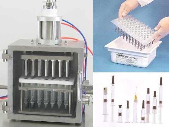 预充式注射器用加塞机是向预充式注射器内装入胶塞的专用设备。具有无空气、产量高、无污染等优点。产量可达到:7000支/时。如果客户使用的散装注射器,则需要将注射器装在一个蜂巢板(莱姆哈特随装塞机提供一块)中使用加塞机。