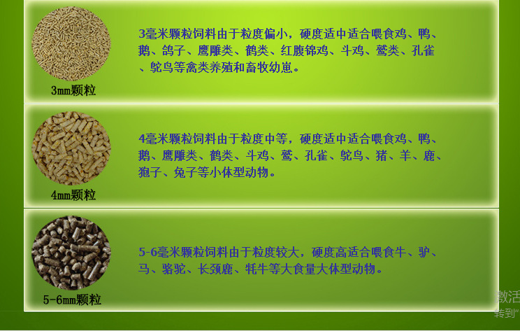 ③饲喂方便,利用率高,便于控制饲喂量,节约饲料,干净卫生。尤其是养鱼,由于颗粒饲料在水中溶解很慢,不会被泥沙淹没,可减少浪费。