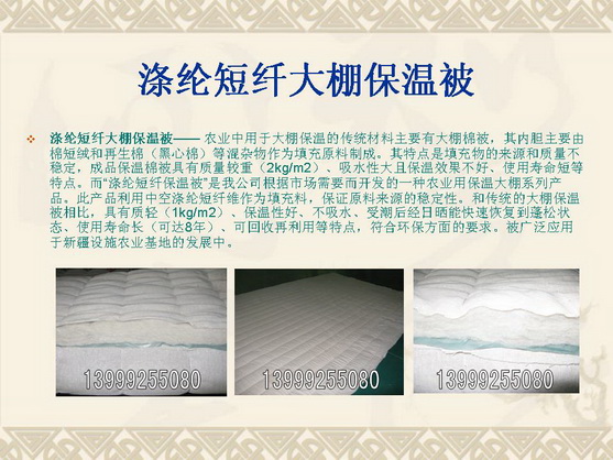 我公司拥有14年土工防渗材料生产经验,是新疆维吾尔自治区科技厅认定的高新技术企业及拟上市公司,产品通过ISO9001/ISO14001国际认证。可长期供应土工防渗材料(聚乙烯土工膜、复合土工膜的生产与焊接、)各规格厚度的无纺布,XPS板。产品广泛应用于水利、交通、环保及矿产,外墙保温等工程中。厂家供应短纤大棚被,具有质轻保暖效果优于传统大棚被,长期有效。欢迎致电垂询。