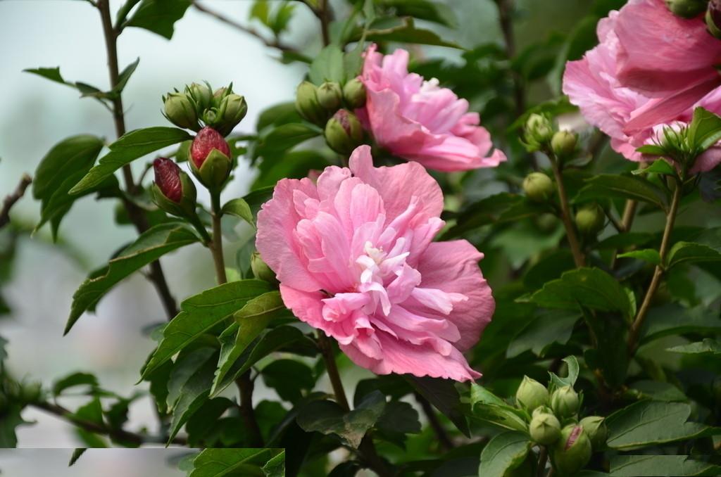 木槿是落叶灌木,高3-4米,小枝密被黄色星状绒毛。叶菱形至三角状卵形,长3-10厘米,宽2-4厘米,具深浅不同的3裂或不裂,有明显三主脉,先端钝,基部楔形,边缘具不整齐齿缺,下面沿叶脉微被毛或近无毛;叶柄长5-25毫米,上面被星状柔毛;托叶线形,长约6毫米,疏被柔毛。