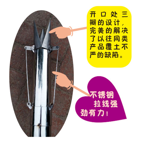 3.头部采用三开口尖顶模式,刨穴快,埋穴实,大大提高了种植速度;