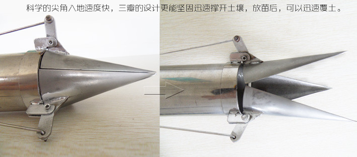 3.头部采用三开口尖顶模式,刨穴快,埋穴实,大大提高了种植速度;