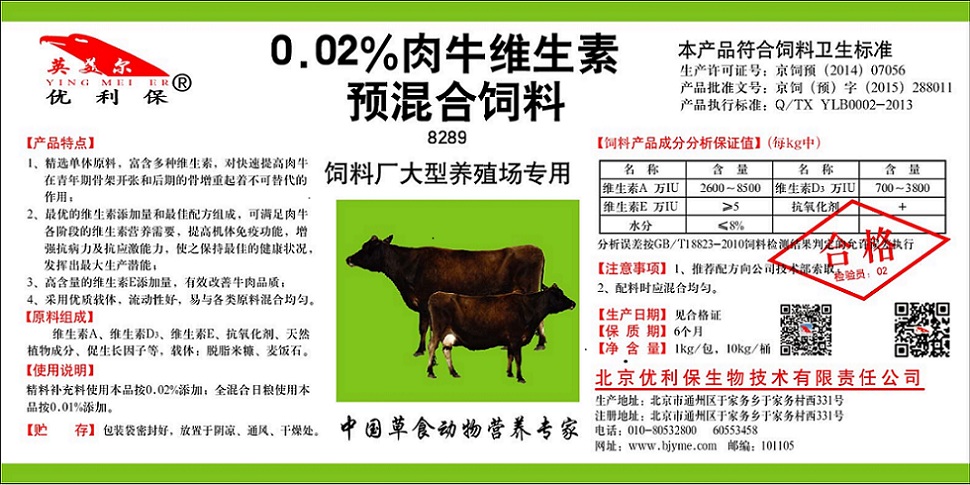 商品描述::饲料厂、大型养殖场专用! 可满足肉牛各阶段的维生素营养需要,提高机体免疫功能,增强抗病力及抗应激能力,使之保持最佳的健康状况,发挥出最大生产潜能。高含量的维生素E添加量,有效改善牛肉品质。