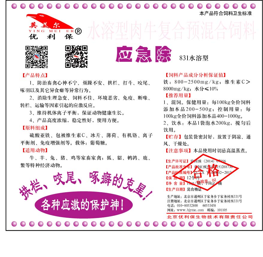 北京优利保生物技术有限责任公司是一家专业做草食动物预混料的饲料厂家,公司不仅销售产品而且还提供养殖技术和饲料配方上的服务。针对消除牛运输应激等有害应激反应,英美尔公司推出了3%肉牛用复合预混料--应急除,适用于断奶,转栏,环境变化等应激前后30天的牛。