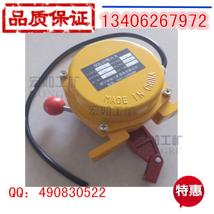 双向拉绳开关工作原理:双向拉绳开关采用旋转式凸轮结构,当拉动开关的任意一侧或同时拉动两侧绳索时,均可驱动凸轮,使开关动作转换,同时发出停机、告警信号。FkLT2—Y型双向拉绳开关配有红色警示旗翻起(便于操作者观察哪台开关动作);故障排除后,按下警示旗,即可恢复正常工作。