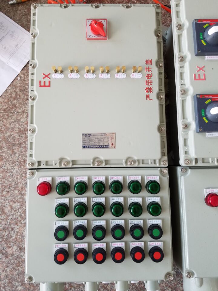 B、非标配电箱:外壳采用钢板焊接成型,表面喷塑。分主腔和接线腔,均采用隔爆型结构,内可选装高分断断路器、交流器、热继电器、控制按钮、灯等元件,通过操作壳盖上的手柄实现分合,性能可靠,并设有分合显示灯。进出线采用钢管或电缆布线均可,进出线口方向及内部元件可由用户要求而定。其它材料及外形均可根据用户要求订制。