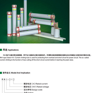 三、技术标准: GB15166-2 IEC280-1 英国BS 德国DIN □RN1型户内高压限流熔断器,用于电力线路的过载及短路保护。所谓限流就是熔断器在短路电流达到峰值之前就将其切断的功能。