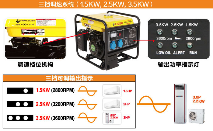 ● 三档可调额定输出功率:1500W / 2500W / 3500W
