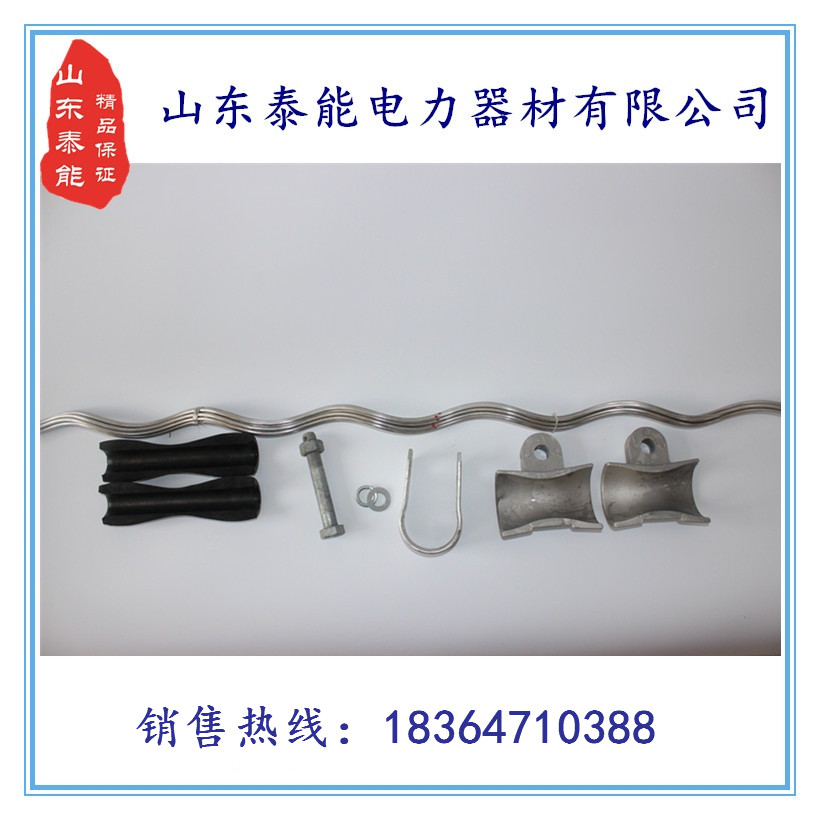 它由橡胶制成的双曲线腰鼓形减振垫,减振垫外缠绕铝合金预绞丝,在预绞丝外装有高强度铝合金套壳,套壳外再加上铝合金U型卡组成,充分利用了双曲线腰鼓形减振垫包住导线于悬挂处,具有握力大,电晕小,重量轻,磁损小,悬挂点应力分散到整个预绞丝长度上,有效减小了导线所受静态应力和微风振动引起的动态应力,避免了导线受损;分散悬挂点的集中应力,也可大大提高导线的抗疲劳性,延长了导线的使用寿命;预绞丝提供了可靠均匀的分散握力,能承受较高的不平衡荷载,从而避免导线滑移,整个线夹的非磁性材料的特殊设计,可降低电磁损耗并消除电晕放电,较传统金具有明显的节能特性;预绞丝结构形成,增强了导线挂点的刚度,增大了曲率半径,单支点线夹可达30度转向角,双支点线夹可达60度转向角;