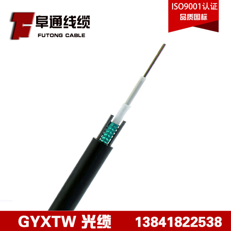 GYXTW 光缆的结构是将 250μm 光纤套入高模量材料制成的松套管中,松套管内填充防水化合物。松套管外用一层双面涂塑钢带(PSP)纵包,钢带和松套管之间加阻水材料以保证光缆的紧凑和纵向阻水,两侧放置两根平行钢丝后挤制聚乙烯护套成缆。