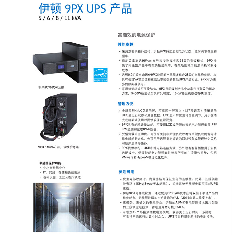 伊顿 9PX UPS 是一款高品质在线双转换式不间断电源。高效节能,通过美国能源之星认证,配备多语言 LCD 显示屏及丰富的通讯接口,并支持即插即用电池模块扩展续航时间,结合伊顿电源管理软件可实现虚拟化操作系统下的电源集中管理。适用于服务器、语音与数据网络和存储系统,是机架式安装和独立安装的优秀解决方案。