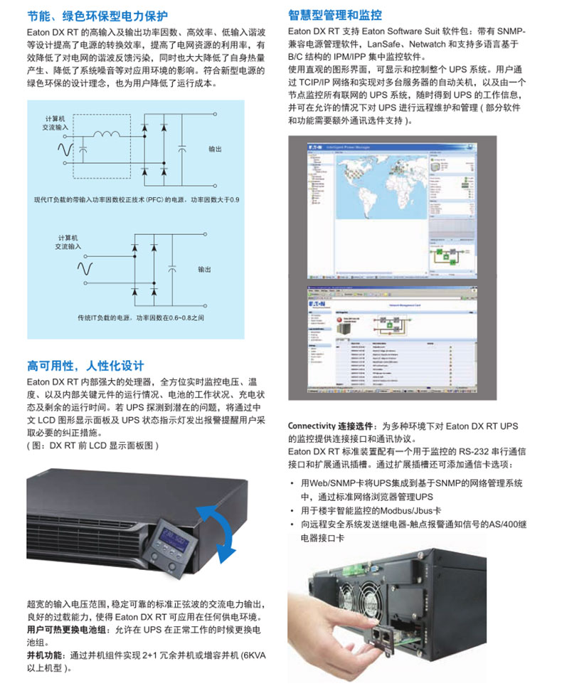 伊顿 DX RT UPS可为关键服务器和网络传输设备、IT机柜、电信通讯、VoIP等设备、银行及安全系统、医疗系统、制造/控制系统、实验室设备、精密仪器仪表等提供安全可靠的电力保护。DX-RT的输出功率因数高达0.9–1,可提供强大的带载能力,与目前已普遍使用了输入功率因数校正电路的现代型计算机设备相匹配,且输入谐波小,绿色环保。