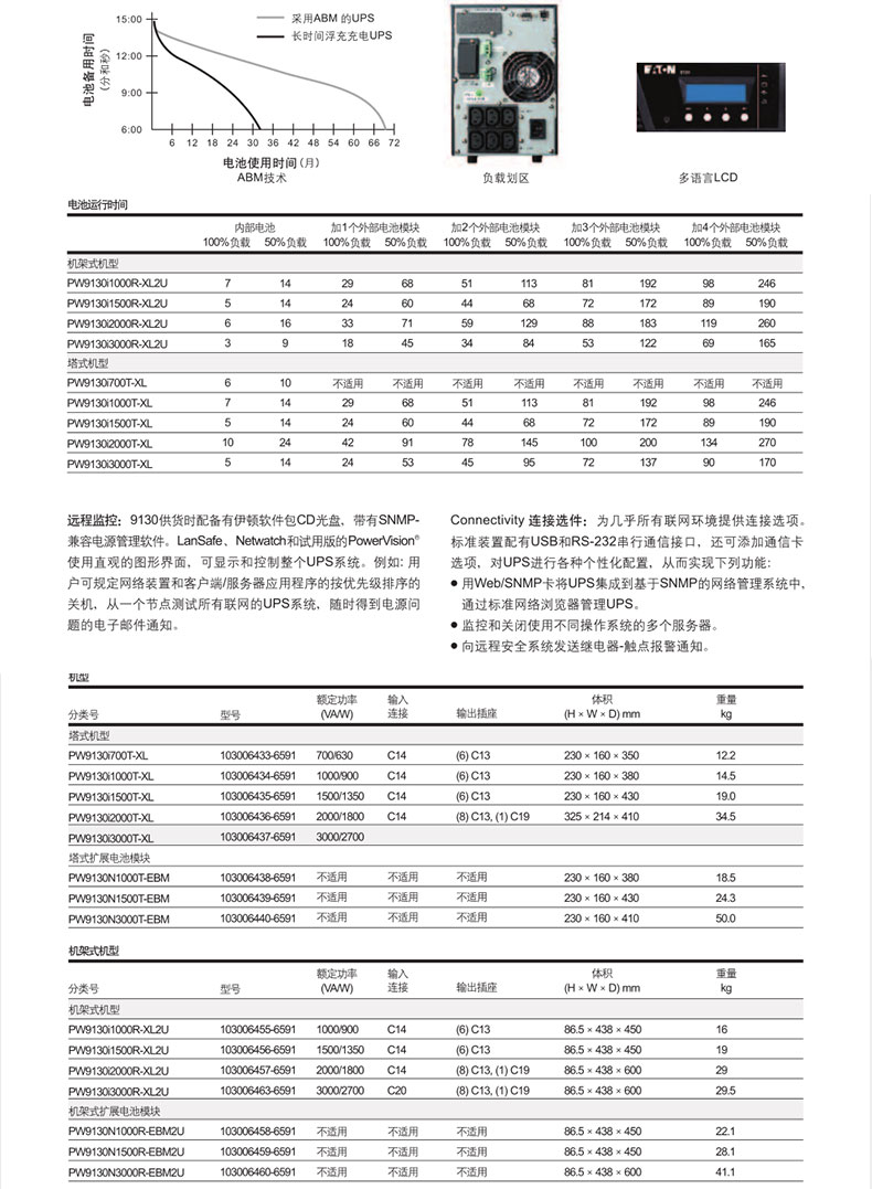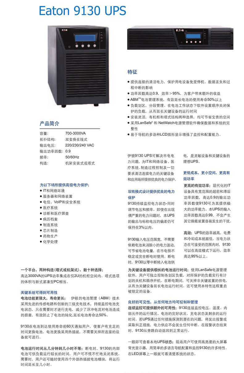 伊顿 9130 系列 UPS 为服务器、语音和数据网络、存储系统和其它 IT 设备提供在线式备用电源,并确保电池运行时间的可扩展性。凭借高于 95% 的能效等级,该系列 UPS 能在降低能源成本的同时,通过 ABM 技术大幅延长电池使用寿命。9130 UPS 还配有清晰的 LCD 用户界面,使监控变得简便。
