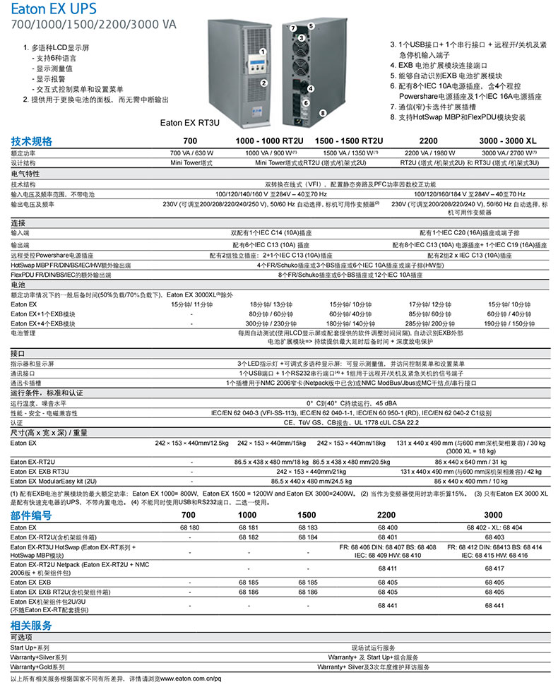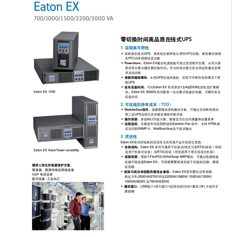 伊顿 DX RT UPS可为关键服务器和网络传输设备、IT机柜、电信通讯、VoIP等设备、银行及安全系统、医疗系统、制造/控制系统、实验室设备、精密仪器仪表等提供安全可靠的电力保护。DX-RT的输出功率因数高达0.9–1,可提供强大的带载能力,与目前已普遍使用了输入功率因数校正电路的现代型计算机设备相匹配,且输入谐波小,绿色环保。
