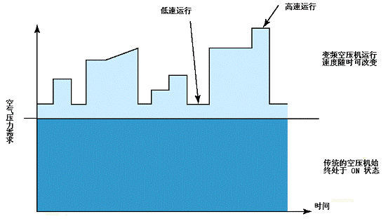变频空压机不存在卸载,因此也不存在空载浪费。