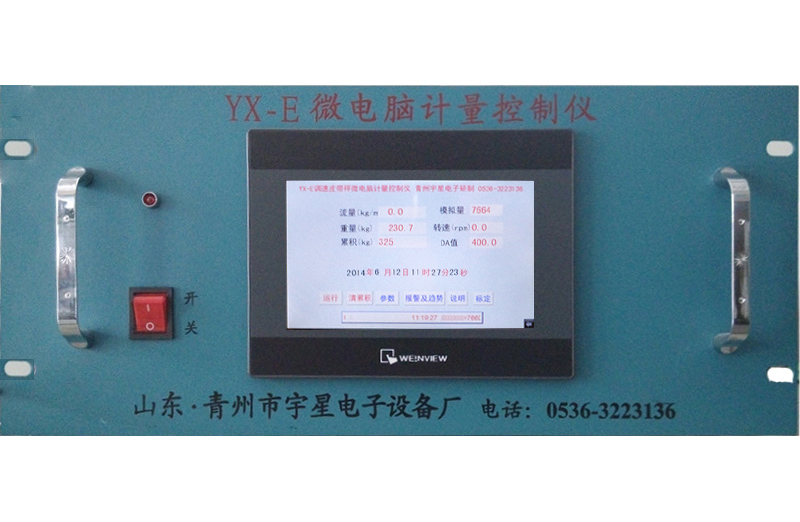 一.概述??YX-E调速秤控制仪应用于各种重量计量控制的场合,可与恒速皮带秤,恒速螺旋秤,调速皮带秤,调速螺旋秤,计量斗称重配料秤配套,实现连续或断续计量,定量控制。配有多个模拟量和开关量输入输出接口,可以方便地与DCS?控制系统及PLC?系统连接。二、主要部件??西门子S7-200系列PLC,?维纶或西门子彩色触摸屏,台湾明纬开关电源,高精度低漂移传感器放大器。三、主要功能及特点1.?采用世界名牌德国西门子s7-200系列PLC,运行稳定可靠。2.?有多个画面,画面简洁直观,有详细文字说明,操作简单,易学易用。3.?重要参数密码保护。所有参数可长期保存,保存期十年。4.?非法操作提示及故障报警。5.?0--20mA?或4--20mA?外部流量设定输入(全隔离输入)。6.?0--20mA?或4--20mA?当前瞬时流量输出(全隔离输出)。7.?有RS485通讯接口,通讯协议:Modbus?RTU.通讯距离:1200m。8.?传感器信号输入:0—24mV.9.?模拟量控制输出:0—10V或0—20mA。10.?可根据用户要求单独设计电路及软件。四、安装及使用注意事项1.?安装仪表的地点应防振、防日晒、防高温烘烤、防冻、防潮、 ?防雨淋。2.?应良好接地,确保所有连接准确无误、牢固可靠。不要与其它 ?大电器设备共用电源线(包括地线)或供电插座,以免影响本 ?设备的性能。3. 传感器电缆线应尽量短,并要远离其它电源线和控制线,以 避免可能的干扰。4.?不要用坚硬物体点击触摸屏,以免造成损坏。5.不能用烃类、醇类、酮类等有机溶剂或强酸、强碱类溶液清洗 ?机壳、面板。6.不要在通电时插拔仪表后板上的接插件或更换保险管、传感器。7.长期闲置不用时,每隔二月左右至少应通电一次,每次一小时 以上,以驱除其内部潮气。8.?应由专业人员定期进行校准,以防止称量失准。五、基本参数流量单位???????????????????????????公斤/分钟。累积单位???????????????????????????公斤。最大信号输入范围???????????????????0--24?mV初始置零范围???????????????????????0--20?mV非线性误差?????????????????????????≤0.005%FS温度系数???????????????????????????≤0.0006%/℃AD采样速率????????????????????????100次/秒RS485?通迅距离?????????????????????1200m称重传感器类型?????????????????????电阻应变式称重传感器传感器激励电源?????????????????????DC5V,≤100mA传感器接口输入阻抗?????????????????≥20MΩ触点输出??????????????????????????机械触点,?DC36V?、2A??AC220V、2A供电电源???????????????????????????AC185~265V,50HZ±2%消耗功率???????????????????????????≤30W工作环境温度???????????????????????-10°C~40°C工作环境湿度???????????????????????≤90%相对湿度(无凝结水)