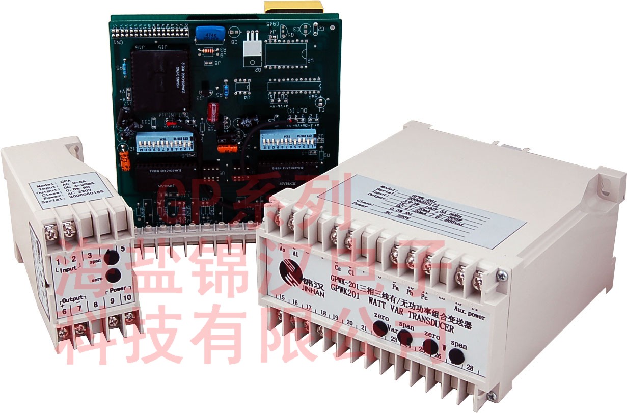 GP系列变送器,采用ASIC芯片(特制变送器厚膜电路)、超线性电压、电流互感器等全套进口散件,配以全套进口生产设备和电脑检测校验系统,按国际质量保证体系ISO 9001:2000组装生产,规格齐全,有电压、电流、有功功率、无功功率、有功电能、无功电能、频率、功率因数、负序电压、负序电流等全系列各种规格的电量变送器。