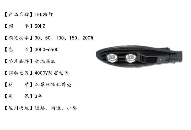 LED色温:白偏黄、暖白、正白 发光效率:90Lm/W以上 显色系数:R>75 配光曲线:蝙蝠形配光曲线或矩形光斑 防护等级:IP65环境温度:-40~50℃ 使用寿命:>50000h