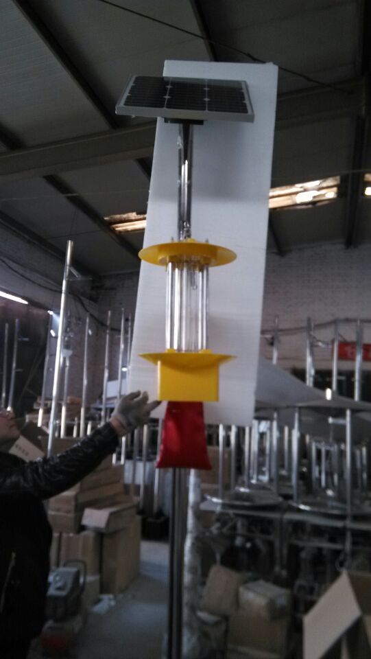 太阳能频振式杀虫灯是利用太阳能电池板作为用电来源,其将白天太阳能发的电贮存起来,晚上放电给杀虫灯具,供其工作。运用光波诱杀方式杀灭害虫,即利用放电产生的低温等离子体形成365±50nm波长色光,引诱害虫飞蛾扑灯,外配以频振高压电网触杀,从而达到杀灭成虫、降低田间产卵量、减少害虫基数、减少农药残留的目的。