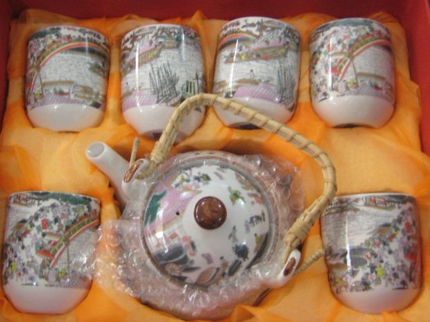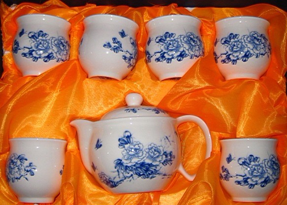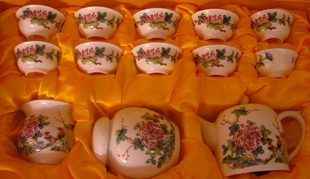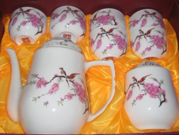 景德镇陶瓷茶具,种类繁多,造型优美,除实用价值外,也有颇高的艺术价值,因而驰名中外,一直深受历代陶瓷茶具爱好者的青睐。具有坯质致密透明,上釉、成瓷烧制温度高,无吸水性,音清而韵长等特点。因色泽洁白,能反映出茶汤色泽,传热、保温性能适中,加之色彩缤纷,造型各异堪称饮茶器皿中之珍品。元代,江西景德镇青瓷茶具已远销国外。如今,景德镇陶瓷茶具更是面目一新。陶瓷茶具,适合冲泡各类茶叶。加之青花手绘陶瓷茶具造型精巧,装饰典雅,其外壁多绘有山川河流,四季花草,飞禽走兽,人物故事,或缀以名人书法,又颇具艺术欣赏价值,所以,使用最为普遍。