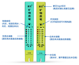 测饮用水:将转换按钮向左,按住开关按钮,将测水笔放进待测溶液当中(不要超过水位线),轻轻搅动除去笔中气泡,观察灯亮的数量,然后再读数使用完毕后甩干笔头上的水。