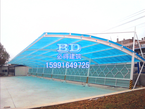 2、雨棚整体采用钢结构加工制作,结实耐用,顶部采用锁扣阳光板制作,可使用十年以上