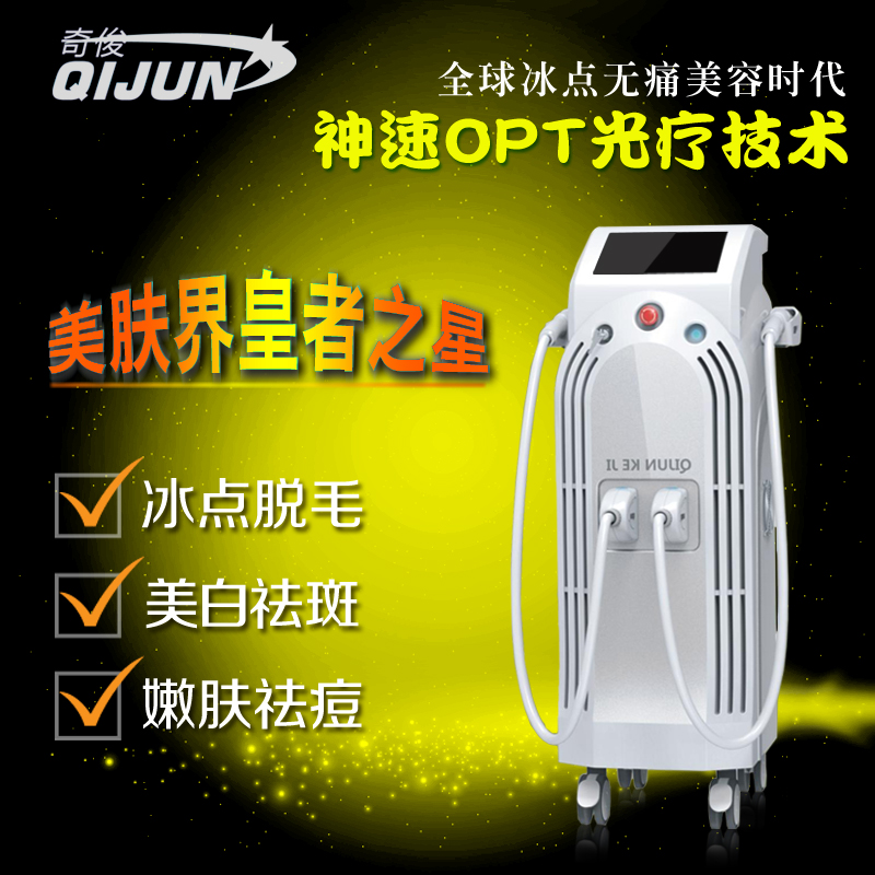 奇俊超级OPT美肤仪采用强脉冲光能量+RF射频+表面冷却三大核心,完美OPT平顶方波技术;是在光子/E光的基础上经过研发改进的一套先进治疗仪器,是目前世界上最先进的、唯一可延展的、覆盖了当今所有热点技术的多用途医疗美容系统,具有完美脉冲功能的强脉冲光技术,是目前唯一一台能顺利透入皮下技术。