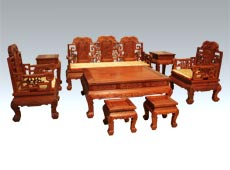 客厅的家具根据该室的活动和功能性质来布置,其中最基本的包括茶几在内的一组休息、谈话时使用的座位,一般为时尚而精致的现代风格沙发,在客厅中显得富有时代气息。而两只成对的圈椅或官帽椅,同样也可以与西式沙发和平共处,不但营造出东方特有的人文风采,同时也很具有实用功能。在看腻了成套成组的沙发后,如果换上两把扶手椅或太师椅,或者改放一对明式圈椅或低背玫瑰椅,采用传统的两椅一几的配置,或者在起居室中沙发前方居中而放的大茶台,如果空间许可,只要一张明式红木炕桌,就可以成为视觉的焦点,并且面大正方好用,与一般沙发尺寸颇能配合,并且能给人耳目一新的感觉。沙发角落置放电话的小几也可用红木方凳或花几代替,往往成对摆设各据一方,也可单独一只放置,另一方摆一个暖色立灯,效果也很好。同样也可以突破思维定势,用以放置电视音响的低柜,如果换为一三联或二联闷户橱,或者以长方条凳取代之,也是一种大胆的尝试。电视柜同样空出两侧,不一定得摆满,如有一侧靠窗,可顺势摆置一高盆栽以活化空间,制式的电视柜组繁复又占位置,影响其它家具呼吸空间,不如换换想法,生活可以更合适。