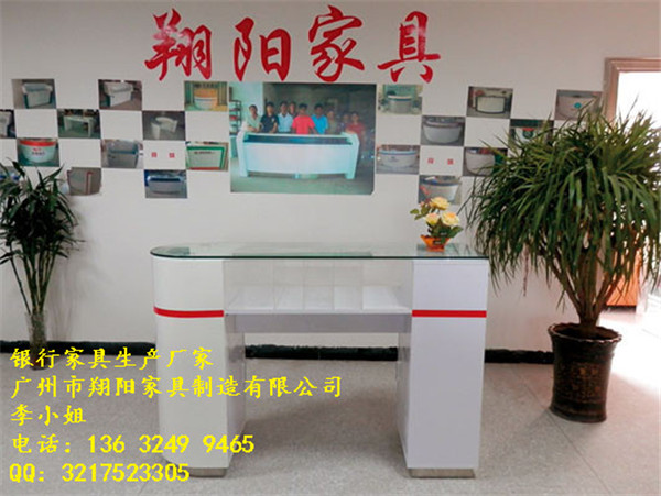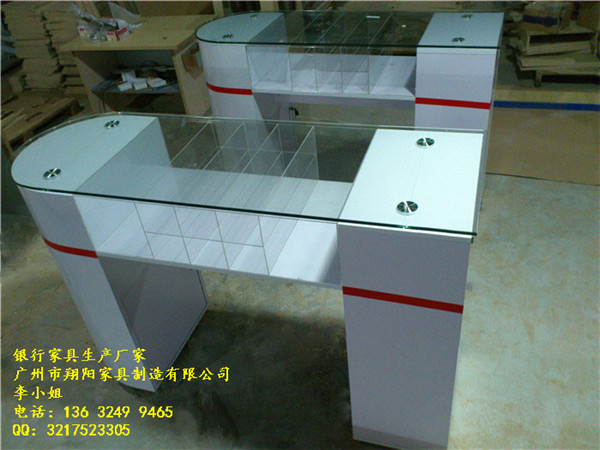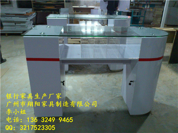 材质:10mm钢化玻璃面板,白色烤漆台身,拉丝不锈钢底座,亚克力票据盒。