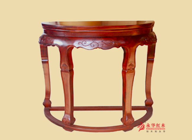 此半圆台通体为大红酸枝。台面为半圆形,攒框镶板,面下束腰,牙板浮雕卷草纹,足承半圆形托泥。造型丰盈独特,线条流畅优美,装饰华美新颖,透着优雅隽秀之韵。此台具备使用与收藏价值,属当代仿古家具精品。